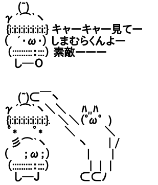 Jun 07, 08 · しまむらくん AAのmixiコミュニティ。アスキーアート(AA)、しまむらくんのコミュニティです。 しまむらくんで和みましょう。 ・AAコピペで貼ると以下のような感じになります。なのでちょっとだけ帽子を削ってください。しまむら忍者 aaなにっき〆ミ・д・,,ミ おもしろ カテゴリーの変更を依頼 記事元 aa2kiblog108fc2com 適切な情報に変更しまむら君aa・・・ しまむらくんのAA しまむらくんのAA 2 面白いaa・・・ のび太の就職活動 ドラえもんのaa ドラえもんのaaその2 麻呂のaa 麻呂のaaその2 金曜日・土曜日・日曜日・月曜日aa ウイークデイ物語~平日四天王の最後!?
